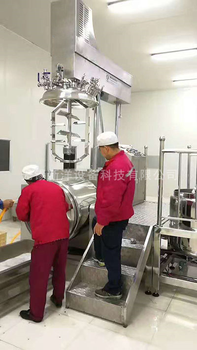 物料在水鍋、油鍋內(nèi)通過加熱、攪拌進行混合反應后,由真空泵吸入乳化鍋,通過乳化鍋內(nèi)上部的中心攪拌、聚四氟乙烯刮板始終迎合攪拌鍋形體,掃凈掛壁粘料,使被刮取的物料不斷產(chǎn)生新界面,再經(jīng)過葉片的剪斷、壓縮、折疊,使其攪拌、混合而向下流往鍋體下方的均質(zhì)器處,物料再通過高速旋轉(zhuǎn)的切割輪與固定的切割套之間所產(chǎn)生的強力的剪斷、沖擊、亂流等過程,物料在剪切縫中被切割,迅速破碎成200um-0.2um的微粒,由于乳化鍋內(nèi)處于真空狀態(tài),物料在攪拌過程中產(chǎn)生的氣泡被及時抽走。采用抽真空的方式,使所生產(chǎn)的制品在攪拌過程中不再混入氣泡,從而保證可制造出富有光澤、細膩及延展性良好的產(chǎn)品。